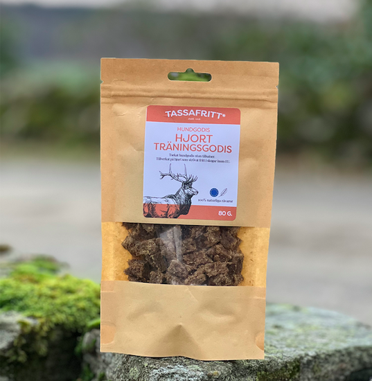 Hjortgodis i små, tärnade bitar (ca 5×5 mm), vilket gör dem perfekta som belöning under träning eller som extra gott på promenader.