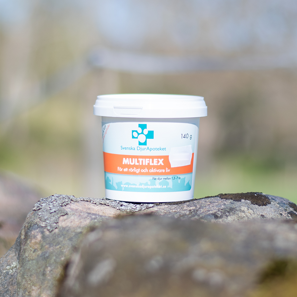 Svenska DjurApotekets MultiFlex är en kombination av flera olika ledprodukter som Glukosamin, MSM, Grönläppad Mussla, Kondroitin och C-vitamin. MultiFlex innehåller även aminosyran L-arginin som kan öka blodtransporten genom kroppen.